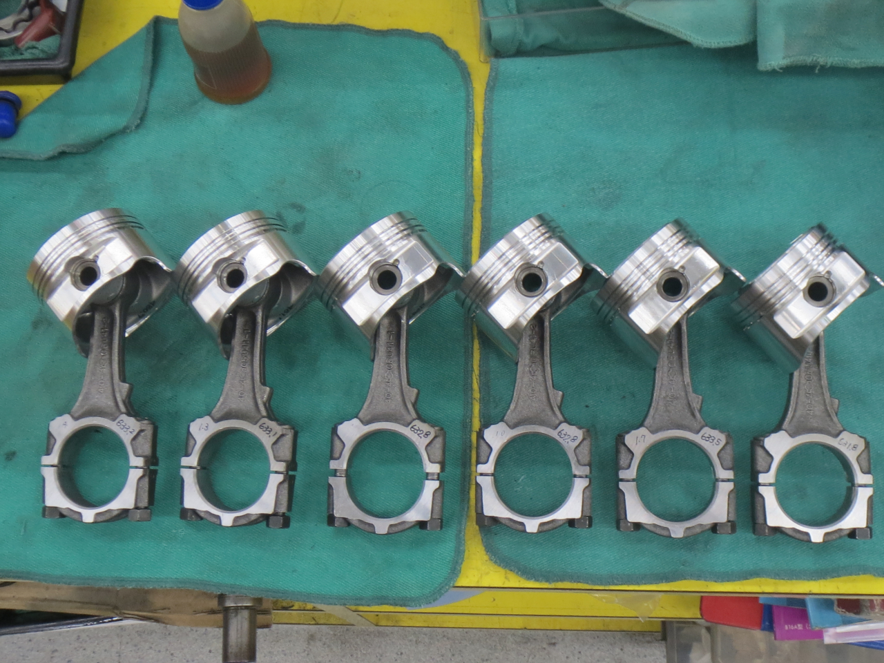 ブロックと一緒に加工に出していましたピストンも返却されましたので、コンロッド・ピストンのバランス調整を行い、コンロッド・ピストンを組付けします。今回使用するピストンは、純正ピストンが廃盤となっていますのでTOMEI製86.5φ鍛造ピストンを使用します。本当は、、、車両がオートマ車ともありますので、お客様の希望は純正ピストン仕様のオーバーホールでも良かったのですが・・・今後、どこかのメーカーで純正サイズの86φピストンでも販売してくれるとイイのだが、、、、、
