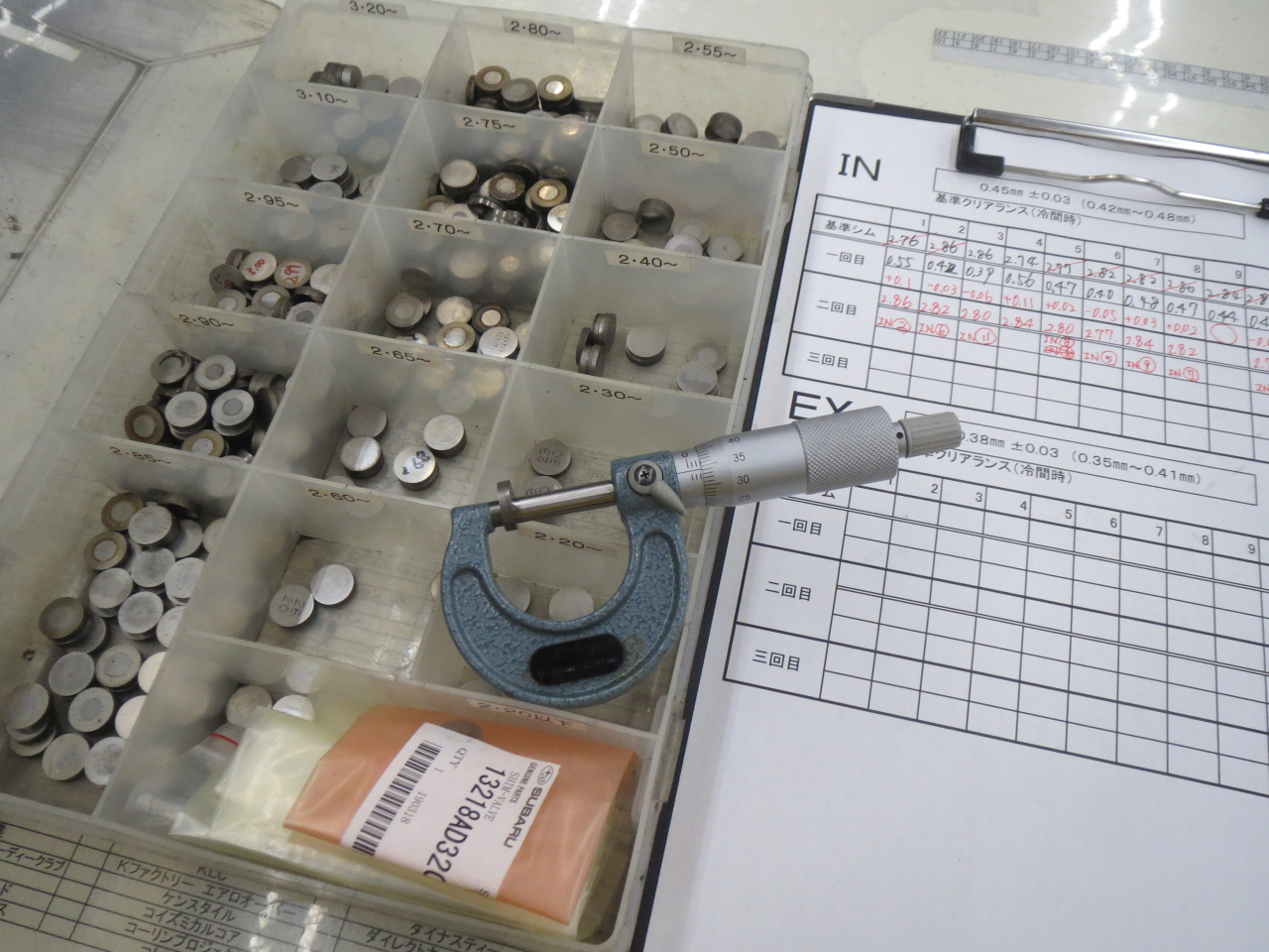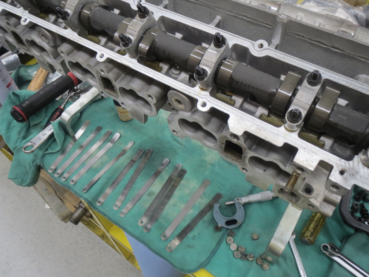 直列6気筒ツインカムエンジン。何気にヘッドの組付け・調整が一番手間・時間がかかる。バルブステムシールを組んで、スプリングシート・バルブスプリング・リテーナーをコッターピンの隙間も気にしながら24ヶ所組付ける。やり慣れていても大変。そして、バルブ・バルブガイドを新品交換、シートカット・バルブすり合わせ・セット長合わせを行っているのと、カムシャフトを社外新品に交換するので、今まで装着されていたシムでバルブクリアランスが合うはずはない・・・エンジン組付けする前に、ヘッドだけの状態でバルブクリアランスをある程度調整しておきます。これまた・・・一度カムシャフトを組むので大変です。しかも、1発でバルブクリアランスは出ないので、何度か同じ作業の繰り返し。でも、この作業がエンジンオーバーホールには大事な作業なので妥協無く終わらせます!!