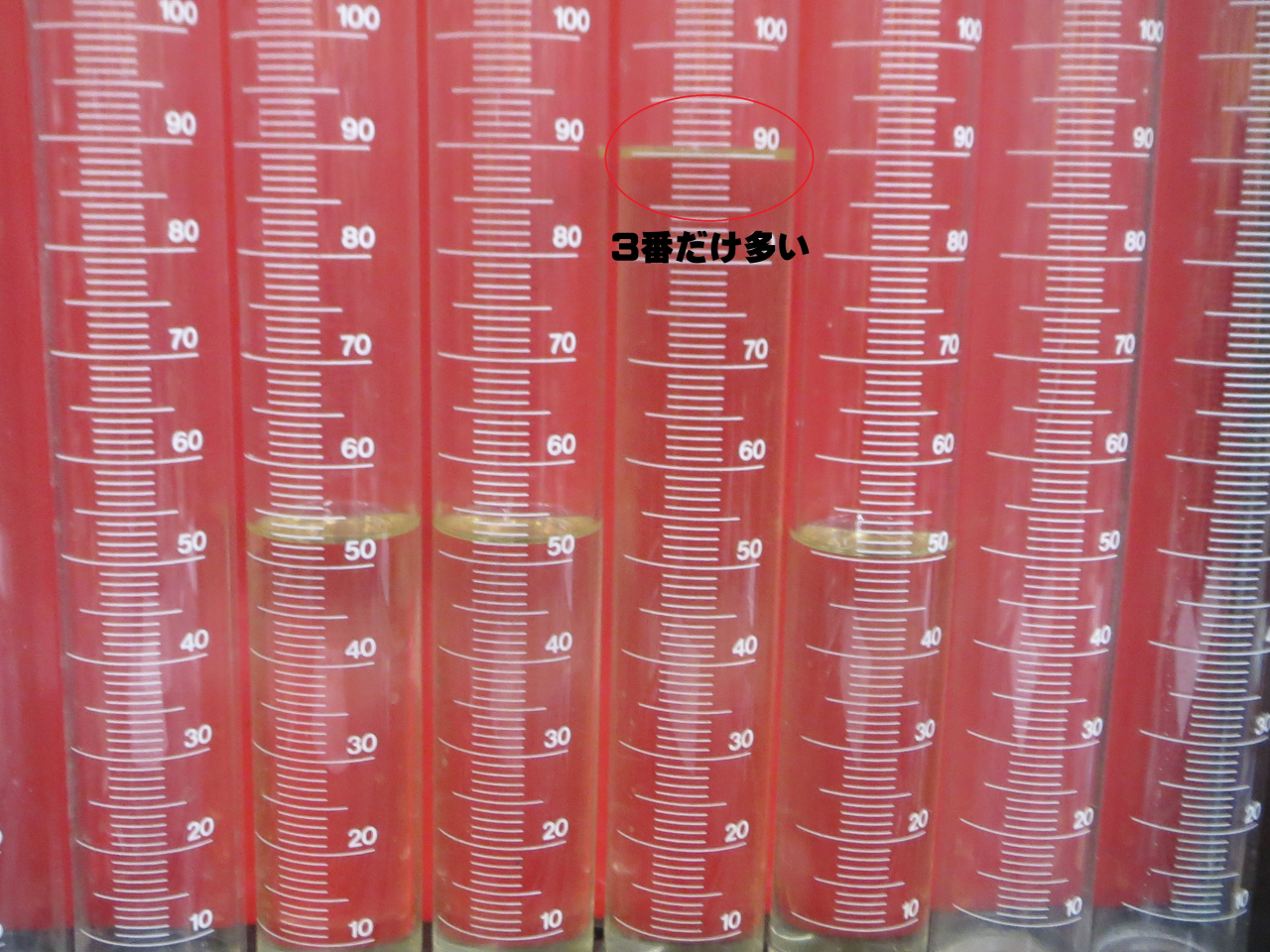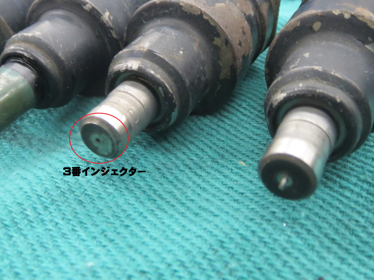 燃圧約3.0Kをかけてリークテスト(漏れ点検)。インジェクター先端・カプラー回り、どちらからも漏れはなく良好。次に抵抗値の確認。このインジェクターは低抵抗なので約3Ωぐらいで作動。これも4本ともほぼ同じ抵抗値で問題なし。次のテストは噴射パターンの確認。実際に噴射させて目視にて点検するのですが、3番のインジェクターだけあきらかに霧化状態が悪い???そして最後のテスト、吐出量の測定。デューティー50/50・燃圧約3.0K・約30秒の測定・・・・!?噴射パターンの悪かった3番インジェクターの吐出量が多すぎる!!原因はなんだろう???とインジェクターをよく見てみると、、、、3番インジェクターのピンドル部が無くなっている!!恐らく、過去にインジェクターを落としたのか?何処かにぶつけたのか?で、先端をヘコませてしまったのだと思う。先端のスラッジの付着から、今回外した時になった感じではないので、かなり前!?からこの状態だったんだろう~ぅ????
