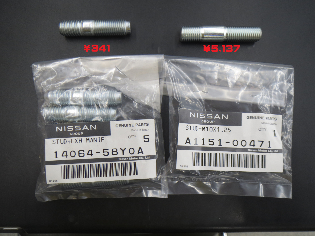 スタッドボルトの価格のイメージですが、例えば、ARP製のヘッドスタッドボルトセットなどは、車種にもよりますが1台分3~5万円ぐらいのイメージだと思います。これに関しては「社外品・強化品だから数万円するのは判る」と思います。それが、、、日産の一部スタッドボルトは「1本=5千円越え」をしてしまっている(汗)