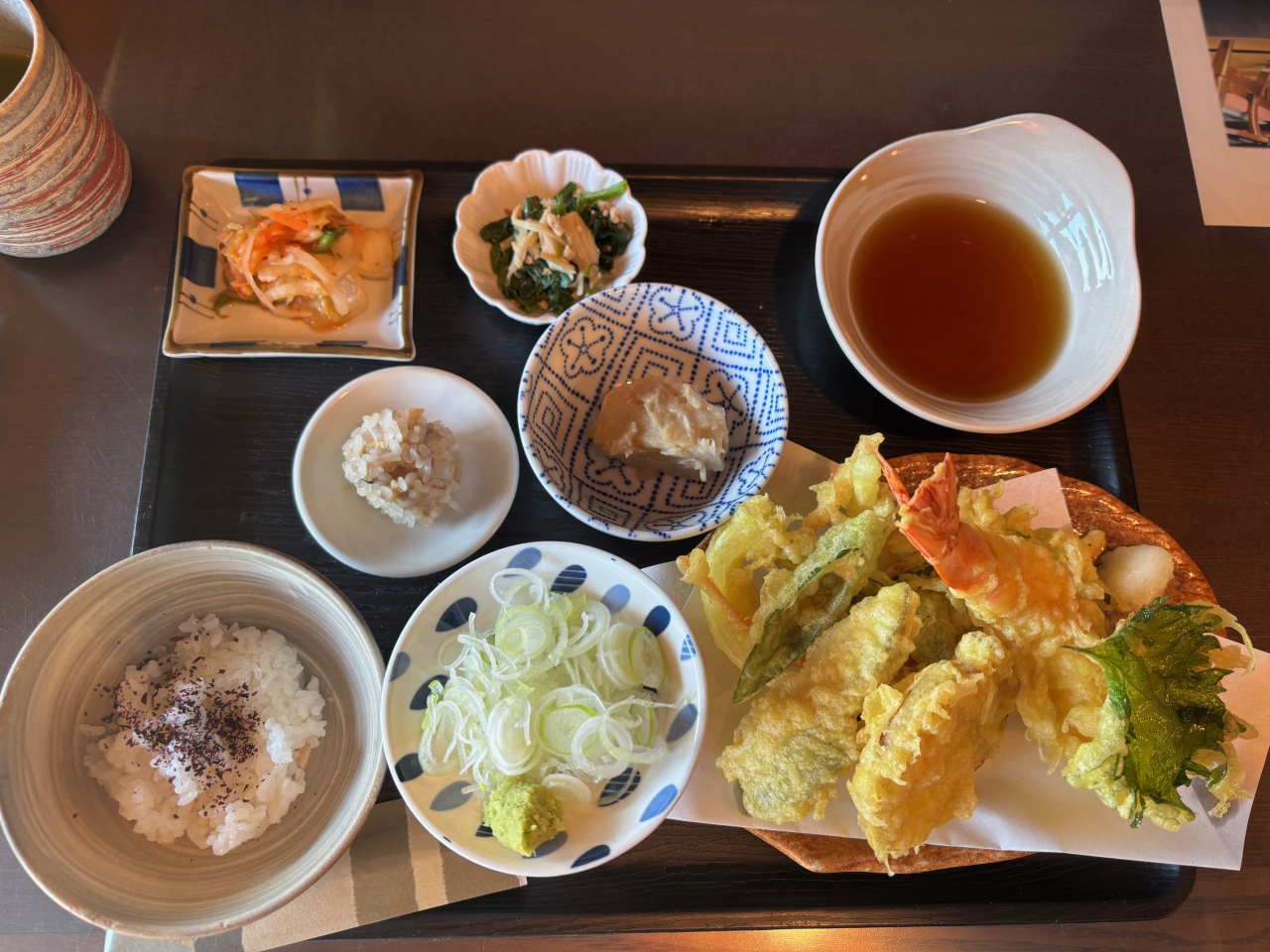 でてくるのは石臼引きの手打ちそばと天ぷら、二十四節季に合わせた小鉢がついてきてお腹いっぱいになります!